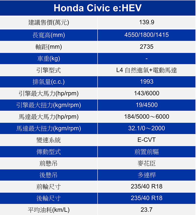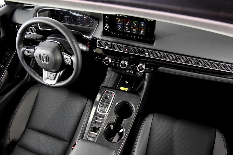 配備18吋米其林PS4輪胎。 座艙方面Civic e:HEV也有大幅轉變,以往繁雜的介面已不復見,取而代之的只有簡約直線條設計及提供9吋中控螢幕和實體空調按鍵。座艙格局雖然簡約,但在配備卻提供10.2吋數位儀表、無線充電、全景天窗、Apple Carplay/Android Auto連接、電油系統功率作動顯示、Honda Sensing(ACC主動式車距調節定速巡航、LKAS車道維持輔助、FCW前方碰撞警示、11具安全輔助氣囊、12支Bose揚聲器…等豐富內容。