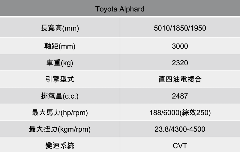 全新Toyota Alphard採單一車型設定,配置2.5升油電複合動力與E-Four電子四驅系統。