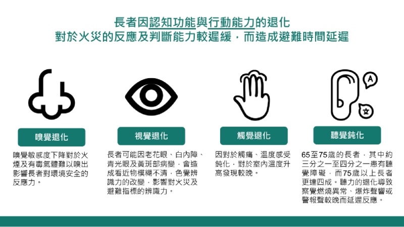 許書華醫師指出,獨居高佔比不僅顯示長者發生意外的風險較高,而且長者因認知功能退化,對於火災的反應及判斷能力較遲緩而造成避難時間延遲,再加上行動能力較為緩慢,需要更長的避難時間。