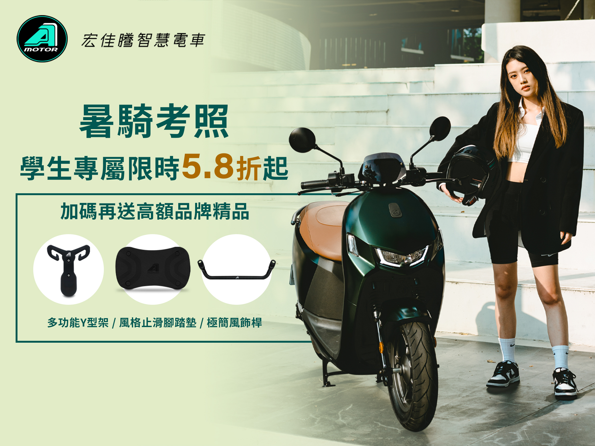 此外,為迎接暑期學生考照旺季,宏佳騰特別推出考照首選車款限時特惠,於優惠期間(即日起至8月31日止),憑學生證購買Ai-1 More可享有6.3折的優惠價格,僅需$55,180元就能入手。同時,購買Ai-3 More更可享最高$6,000元現金折扣,搭配政府補助最低入手價5.8折,新車最低只要$50,180元。除享現金折扣外,還再加贈「多功能Y型架、風格止滑腳踏墊,和極簡風飾桿」一組,讓考照更輕鬆有型。不容錯過的考照首選車款優惠就在宏佳騰智慧電車,一同為您的考照之旅加電打氣。