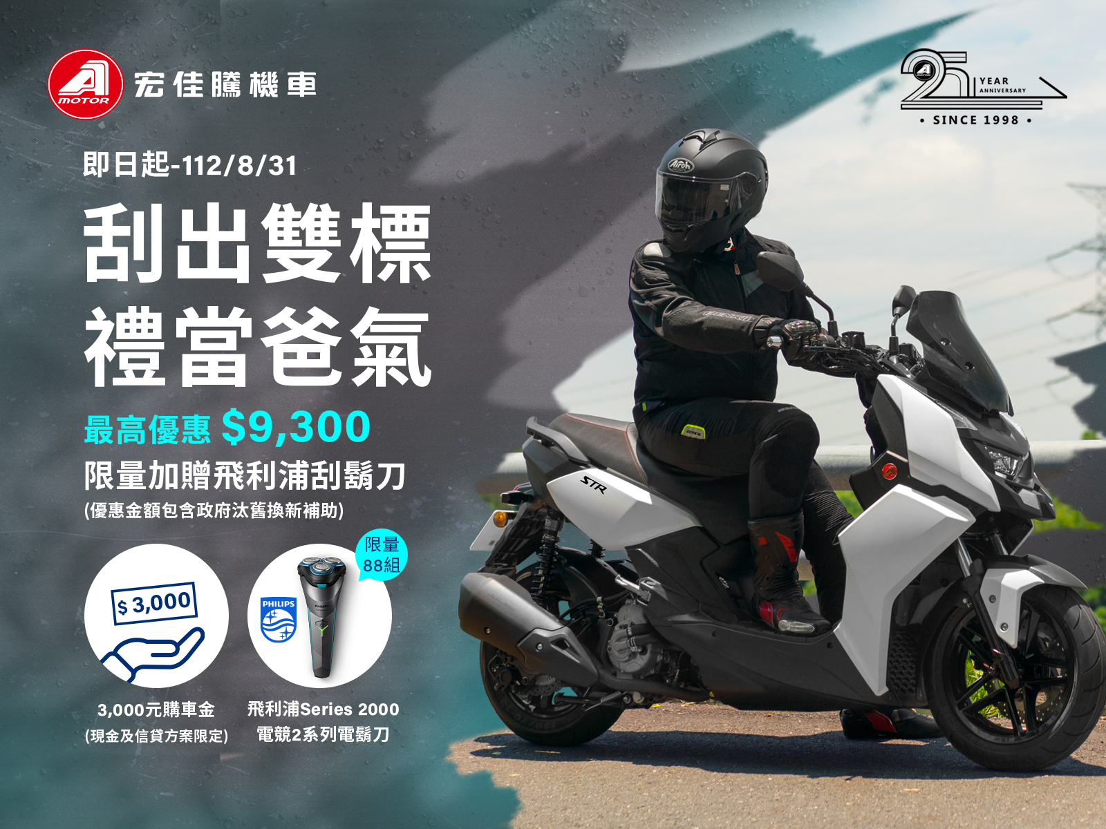 具備精心調校的充沛動力、黃牌強勢路權,以及白牌靈巧車身,兼具多種優勢的STR為男性夢想車款之一,其更是取得出色表現,多次霸榜同級距排行榜冠軍。即日起,凡入主宏佳騰旗艦黃牌STR,即可獲得飛利浦Series 2000 電競2系列電鬍刀一組(價值$2,288元),現金/信貸購車加碼享$3,000元購車金,搭配政府補助最高可享總價值$11,588元購車優惠,另可選擇刷卡分期0利率,自由購車無負擔,優惠限量88組,活動只到8/31,快到全台宏佳騰機車門市購車,跨區駕駛零煩惱。