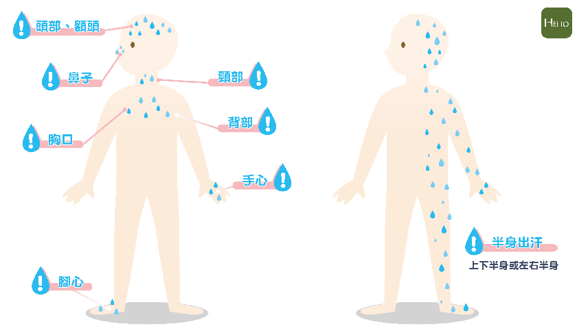半身出汗可能有兩種情形;一種是身體的左半邊或右半邊出汗,另一種則是上半身或下半身出汗。在臨床上的病例發現,中風患者的初期徵兆之一為,身體一側出汗,尤其是不出汗的一側,可能是身體機能出現異常的現象,必須注意。