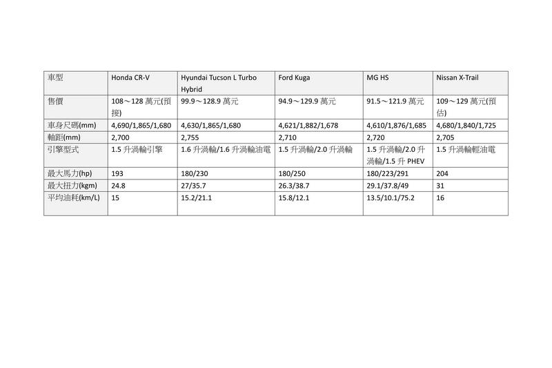 之所以說競爭激烈因CR-V、X-Trail、Tucson L、Kuga、HS等車都各自有過人之處,首先就車價與尺碼和動力方面來看。