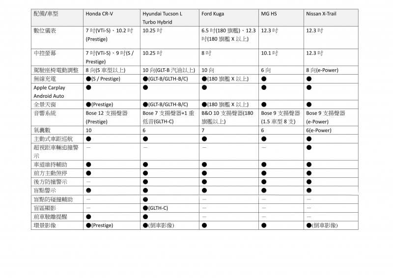 國產休旅車一直以來都是兵家必爭之地,6月Hyundai推出Tucson L Turbo Hybrid後,就替國產休旅爭霸戰拉開戰火序幕,同時Nissan也預告下半年將推出國產X-Trail輕油電車型,除此之外Honda也將在8月正式推出新一代CR-V,隨著市場重量級車款陸續到來,Kuga與HS也祭出優惠與做好準備嚴正以待,近日Honda也公布了CR-V的預接價與規格配備,對此我們也整理了這五款國產休旅的基本規格比拚。
