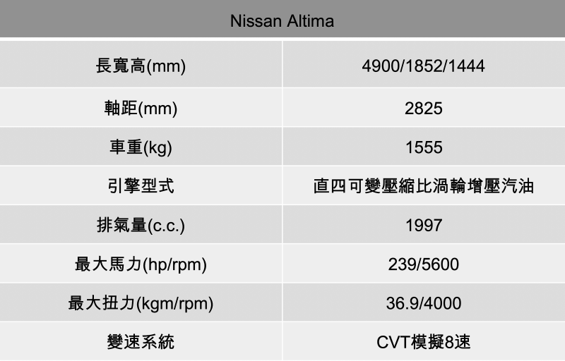 小改款Altima具備239ps與36.9kg-m的峰值輸出,雖比改款前略降但加速體感依舊極為暢快。