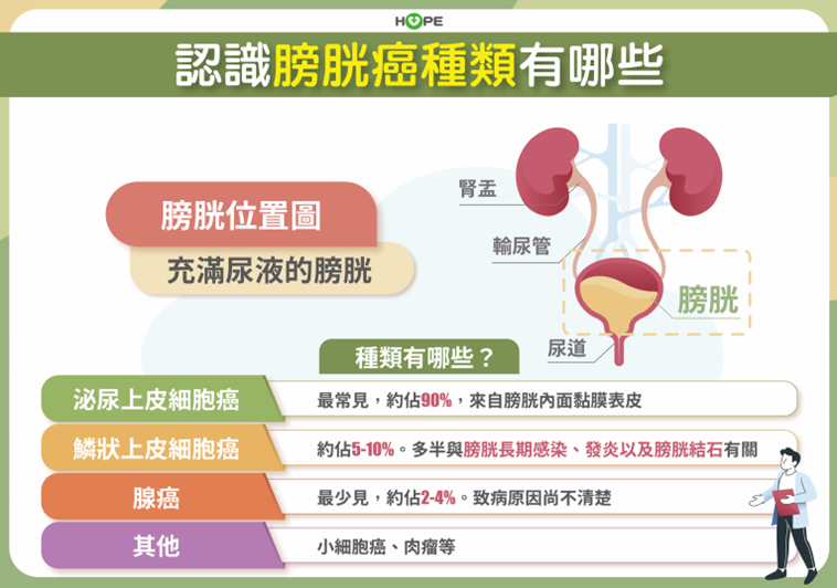 台北榮民總醫院泌尿部主治醫師魏子鈞指出,人體的尿液是由腎臟製造,經過輸尿管,最後儲存在膀胱;這一系列的表皮,就稱做「泌尿上皮」。一般而言長在膀胱裡面的癌症就是膀胱癌,但當中約有 90% 就是這種「泌尿上皮癌」,其他還有鱗狀上皮細胞癌、腺癌、小細胞癌等,治療方法也不盡相同。