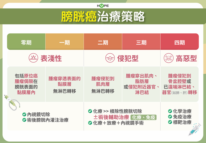 膀胱癌依侵犯的程度分為零期到第四期,零到一期為表淺性,第二到三期為侵犯型,第四期是高惡度型。膀胱癌的腫瘤大小、侵犯的深度,會影響存活率及治療策略。