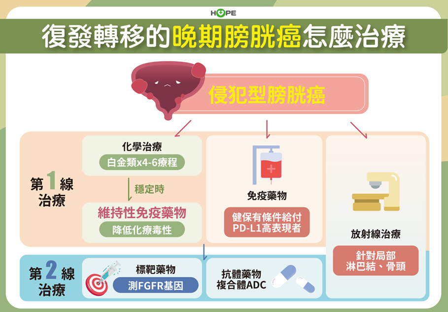 不過,目前復發轉移的晚期膀胱癌還是以化療為主。第一線先做化療,穩定時接著做「維持性免疫治療」,可降低化療毒性也讓療效最大化; 或針對 PD-L1 高表現者直接使用免疫藥物也是治療選擇之一。
