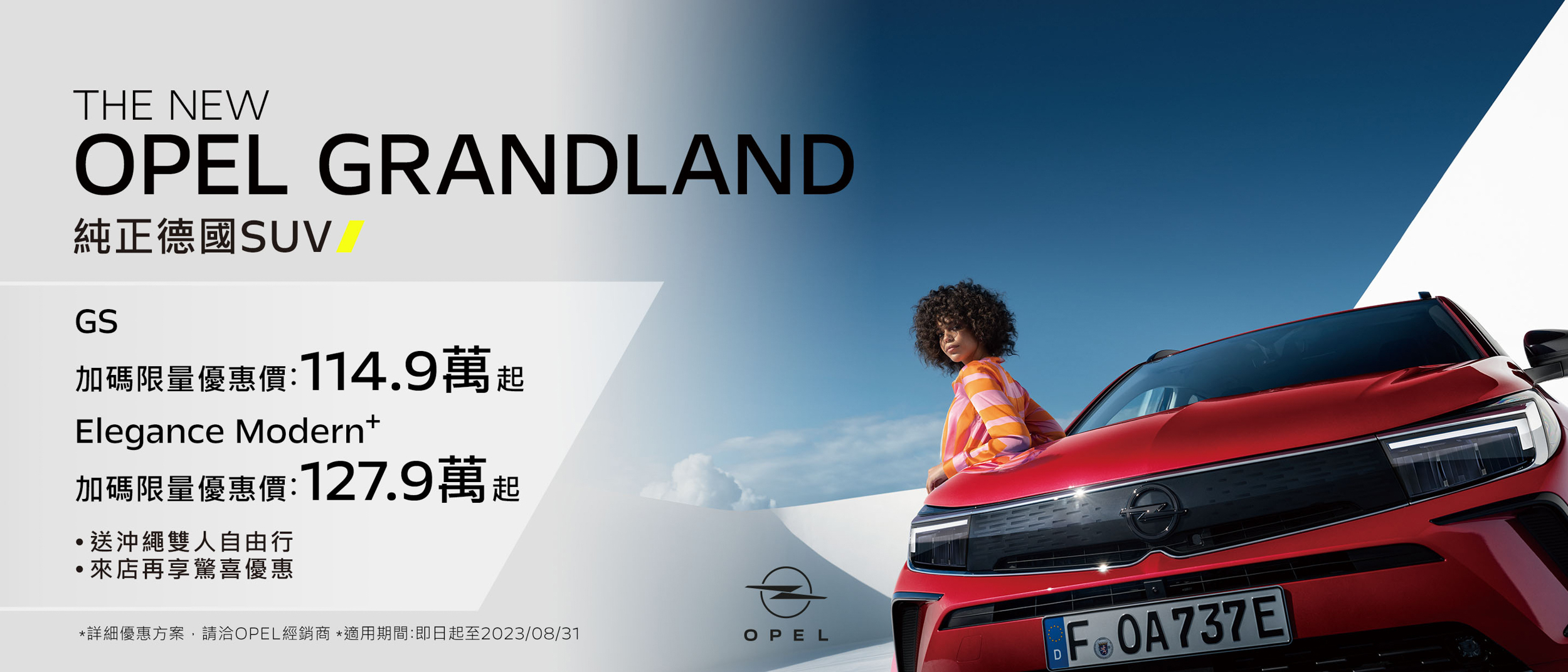 - Grandland GS 加碼限量優惠價 114.9 萬元,入主加贈手機無線充電配備;Grandland Business Elegance Modern+ 加碼限量優惠價 127.9 萬元。