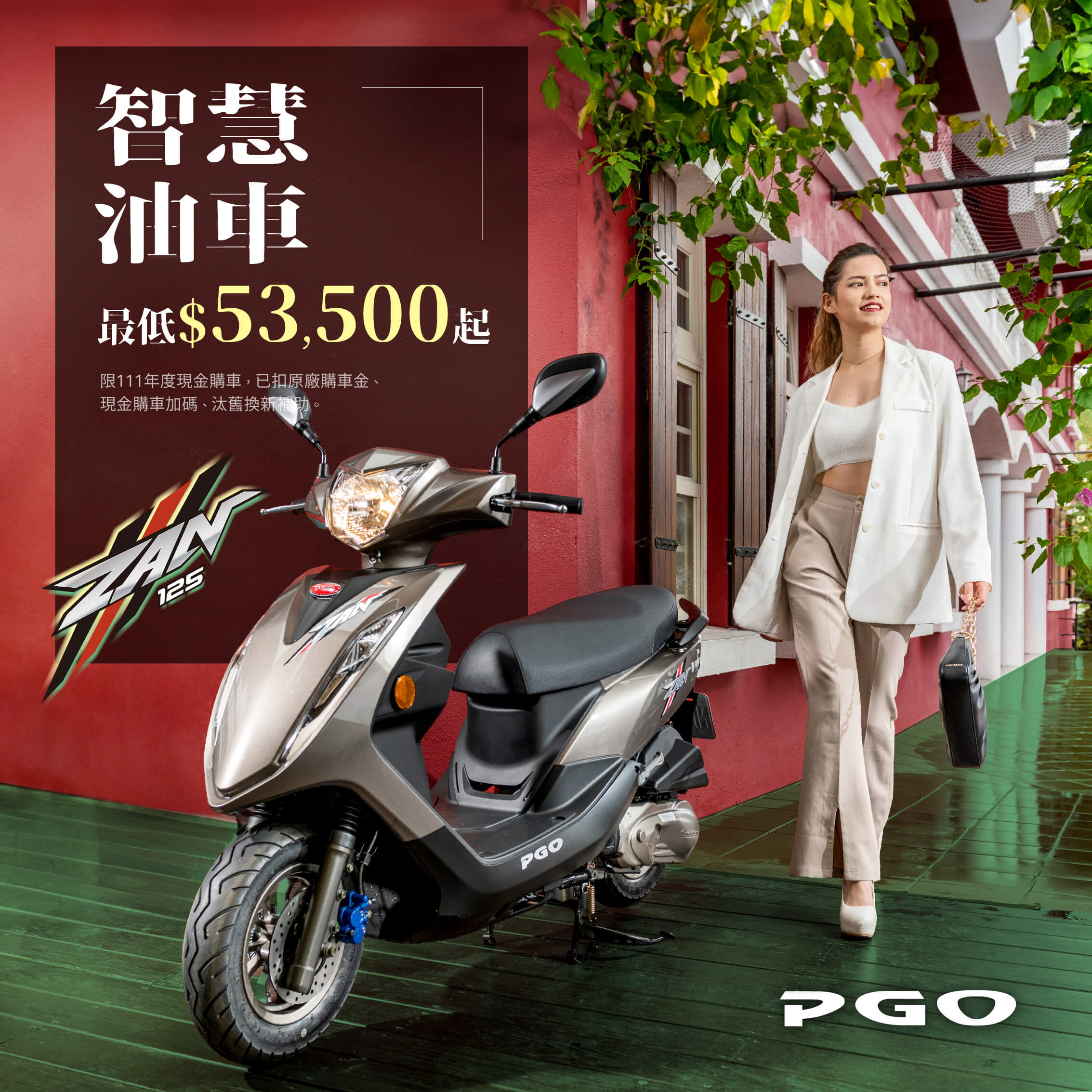 智能車當道,兼具智慧、安全與實用性的燃油車就屬 PGO ZAN125,現正汰舊換新 ZAN125 VCBS版最低價只要 $53,500 元起,另有多元分期方案只要日付53元起,聰明超級省,好戰友就想立即 ZAN 有!