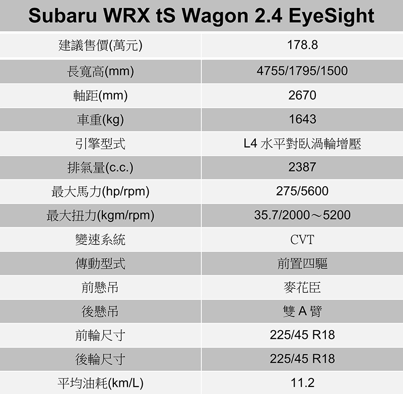 EyeSight 4.0具有AES緊急自動轉向輔助、LVSA前車駛離警示、PCTM預防碰撞油門控制、PCB預防碰撞自動煞車等多項安全系統。 動態方面肯定會是WRX Wagon最讓關注的部分,尤其改搭載的2.4升渦輪引擎,更讓人好奇是否能重燃當年熱火。在搭載2.4升水平對臥渦輪引擎,WRX Wagon動力來到275hp/35.7kgm輸出,變速系統雖仍為CVT,但此次的八速Lineartronic CVT無段變速系統則是全新開發,以往被封印的動力現今也部分獲得解放,也因如此與過往Levorg或WRX相比,WRX Wagon於起步就有著更為輕快的步調,隨著油門逐漸深踩CVT變速系統沒有任何拖泥帶水或不給力,於是乎開始感受到骨子裡野性的一面,然而將模式切至Sport或Sport+就能釋放真實個性,也是老車迷心中WRX Wagon應有的樣貌,但與當年相比現在的WRX Wagon就像是成熟大人般穩重。