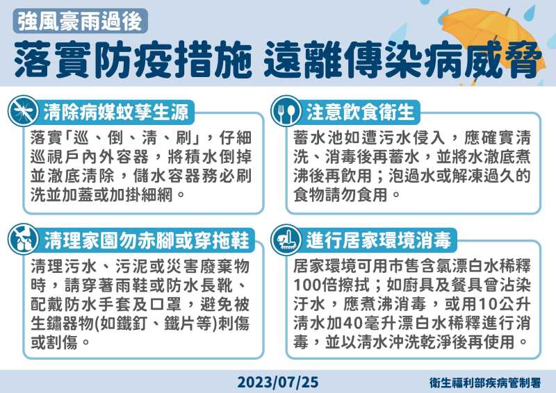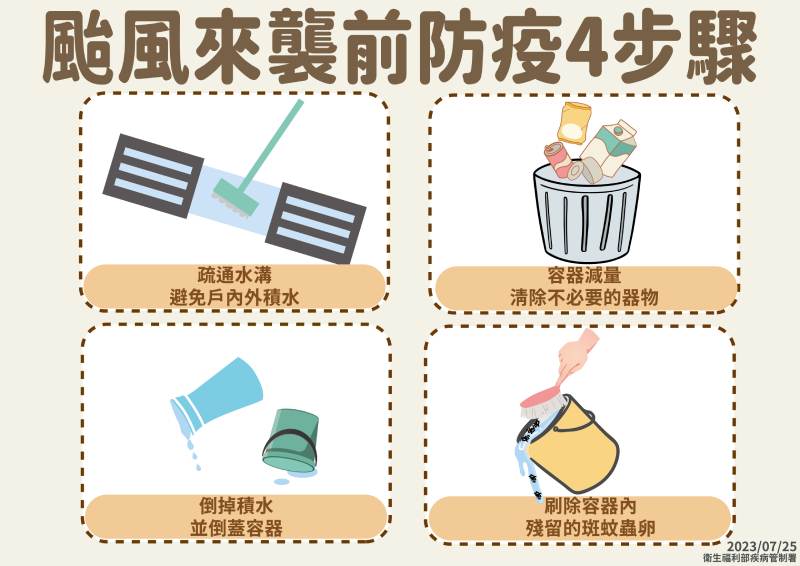 此外,颱風過後更要留意周遭環境、落實防疫清潔工作。疾管署也提醒,強風豪雨過後應做好以下4防疫措施,遠離傳染病威脅:- 清除病媒蚊孳生源: