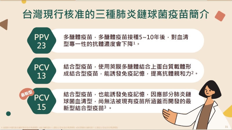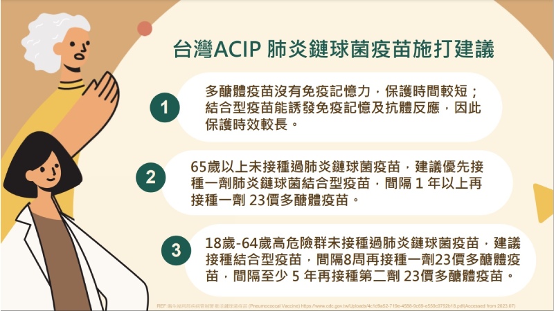 【健康醫療網/記者鄭宜芬報導】台灣每年因肺炎死亡的人數逾萬,目前國內提供71歲以上長者接種23價公費肺炎鏈球菌疫苗。衛生福利部傳染病防治諮詢會預防接種(ACIP)召集人、台大醫院小兒感染科醫師李秉穎27日出席「肺炎鏈球菌疾病衛教記者會」表示,肺炎鏈球菌疫苗接種規劃擬改為65歲以上長者先打1劑結合型疫苗、1年後再打1劑23價多醣體疫苗,最快今年秋冬上路。疾管署證實,目前尚在規劃中。