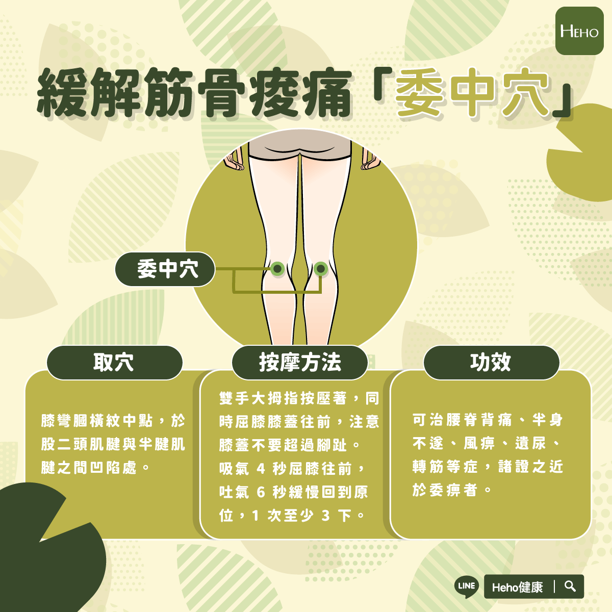 除此之外,筋骨痠痛也可以透過居家保養來緩解,他建議,多多按摩「委中穴」就能舒緩腰髖下肢的筋骨關節痠痛。委中穴是足太陽膀胱經「合穴」屬土及膀胱經的「隙穴」,臨床上以委中穴治療腰痠背痛,甚至雙膝酸軟極有效。