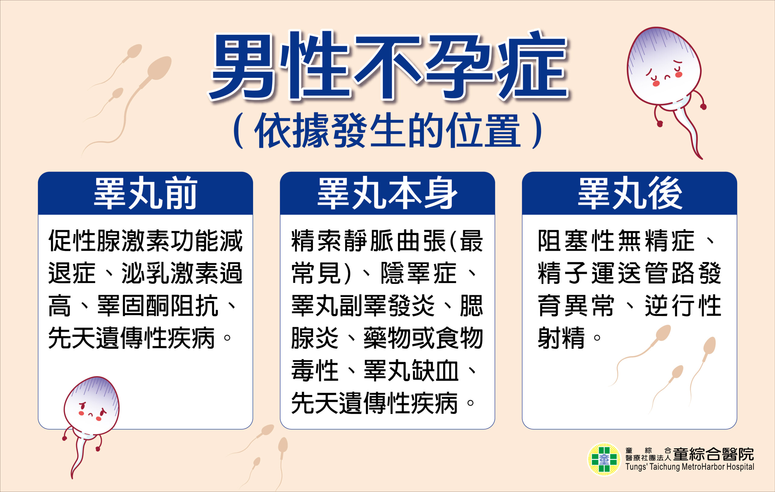 呂謹亨表示,造成男性不孕症第一名的原因,就是精索靜脈曲張,占了 40 %,一般在手術 3 個月後,精液品質就能明顯改善。男性不孕症按照發生的位置,可以區分成 3 種: