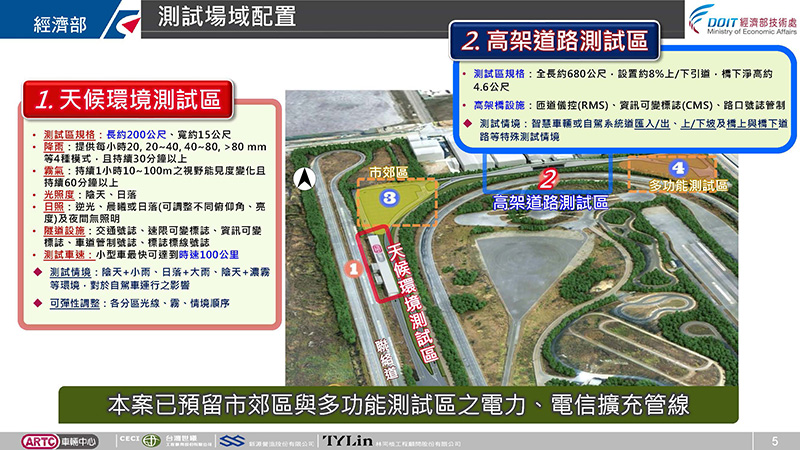 經濟部斥資10億元興建國際級智慧車電驗證環境。其中全臺首座全天候高速自駕驗測場域,可提供大型巴士在超大豪雨、濃霧、隧道或高架橋等行車情境下,執行最高時速達110公里之自動駕駛實車驗證測試。加上陸續完成智慧座艙及電動車動力總成等驗證測試能量後,預期可執行千次以上測試案並創造超過百億以上產值,2025年完工後將可大幅加速我國自駕科技研發速度。