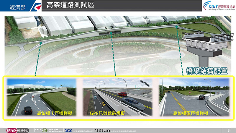 全臺首創3D高架道路驗證測試場域,可測試智慧車輛於匝道的匯入匯出情境,及在高架橋與橋下道路各種車輛的GPS訊號遮蔽測試。
