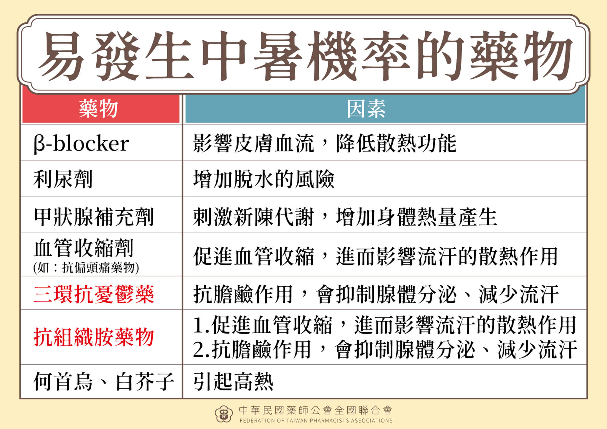不少民眾都有固定在服用特定藥物,但是有些藥物可能在夏季中增加中暑風險,像是憂鬱症藥物會影響排汗、甲狀腺補充劑會促進新陳代謝增加身體產熱、或是利尿劑增加脫水風險。
