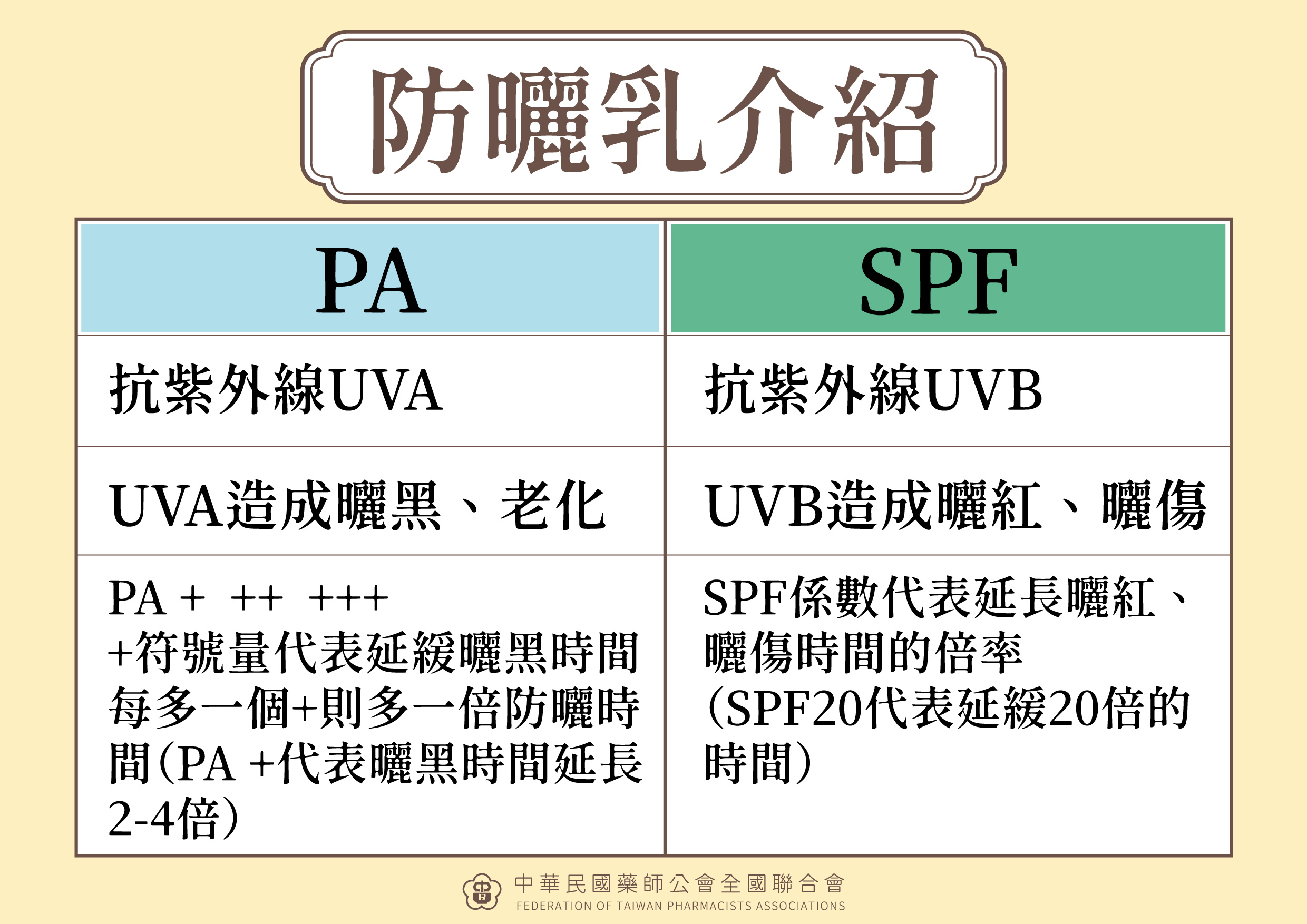 藥師公會中藥發展委員會副主委王儀絜解釋:「紫外線波長分為 UVA、UVB、UVC 主要是前兩者容易對人類產生影響,像是 UVA 容易讓人曬黑、老化、造成曬斑;UVB 則會造成曬傷、曬紅。」為對抗 UVA 的產品防曬係數都是PA+、PA++、PA+++,每多一個 + 則多一倍防曬時間;對抗 UVB 則是用 SPF 係數,此係數代表延長曬紅、曬傷的倍率,若 SPF 20 代表延緩 20 倍時間。