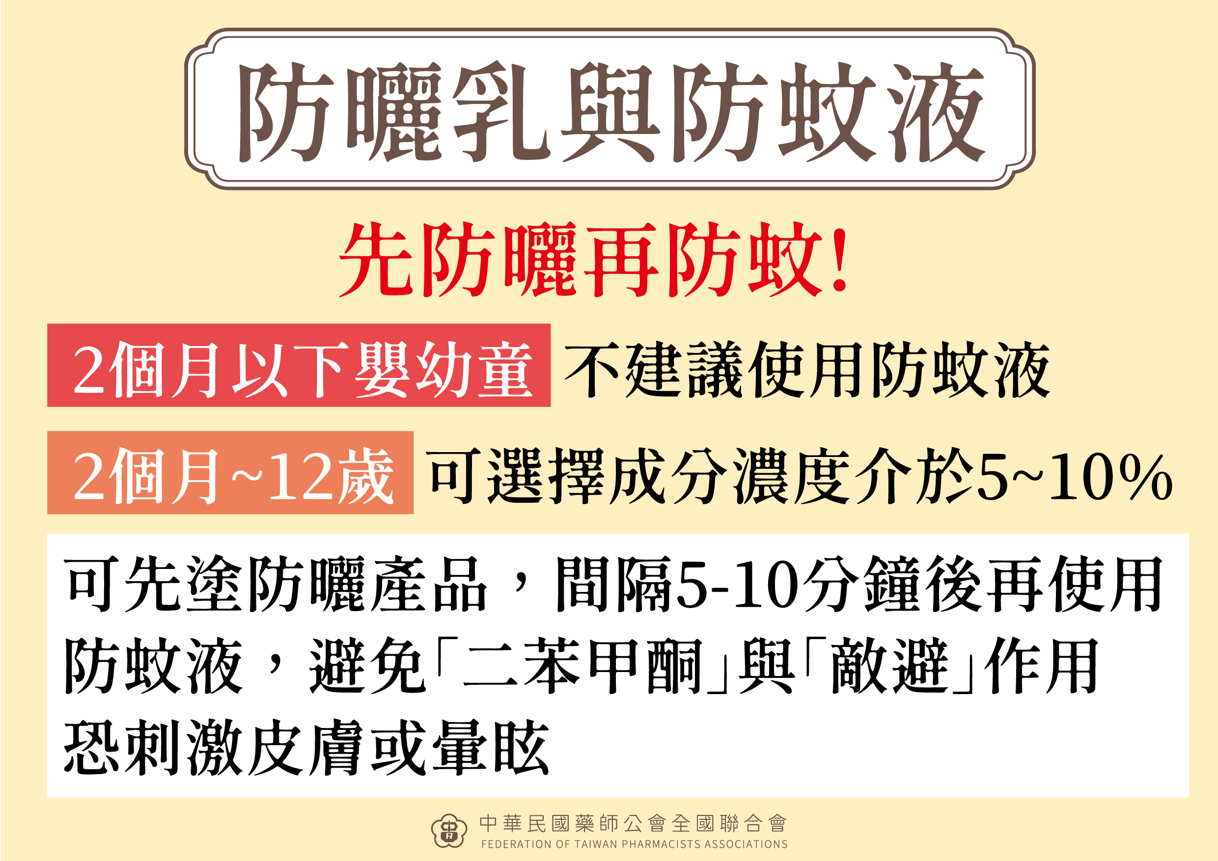 近日登革熱疫情嚴峻,除了擦防曬乳之外,不少民眾也會擦防蚊液,不少民眾也有疑慮兩者是可以合併使用?把握原則得「先防曬再防蚊」而且兩者要間隔 15 分鐘以上,王儀絜解釋:「避免防曬乳中的『二苯甲酮』與防蚊液中的敵避產生交互作用,刺激皮膚造成噁心、嘔吐、暈眩等。」