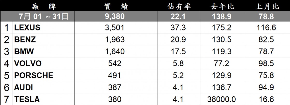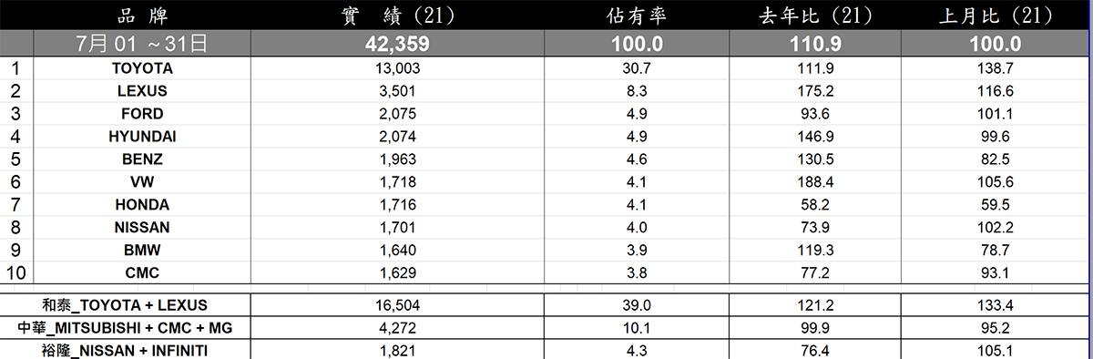 新一代Honda重量級新車第六代CR-V將在8月初正式上市。 7月台灣車市前10大品牌排名數據