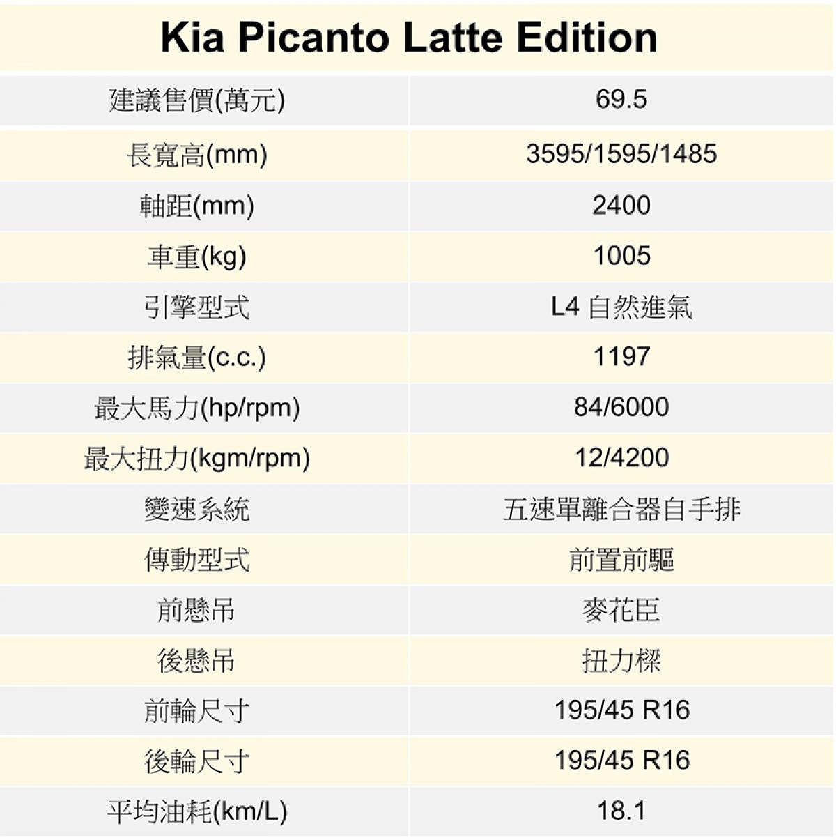 動力部分Picanto Latte Edition也有貼心安排,其搭載的1.2升引擎不僅具有稅賦優勢,同時也提供84hp/12kgm動力輸出,另外油耗方面18.1km/L表現更能進一步替車主節省油費支出。