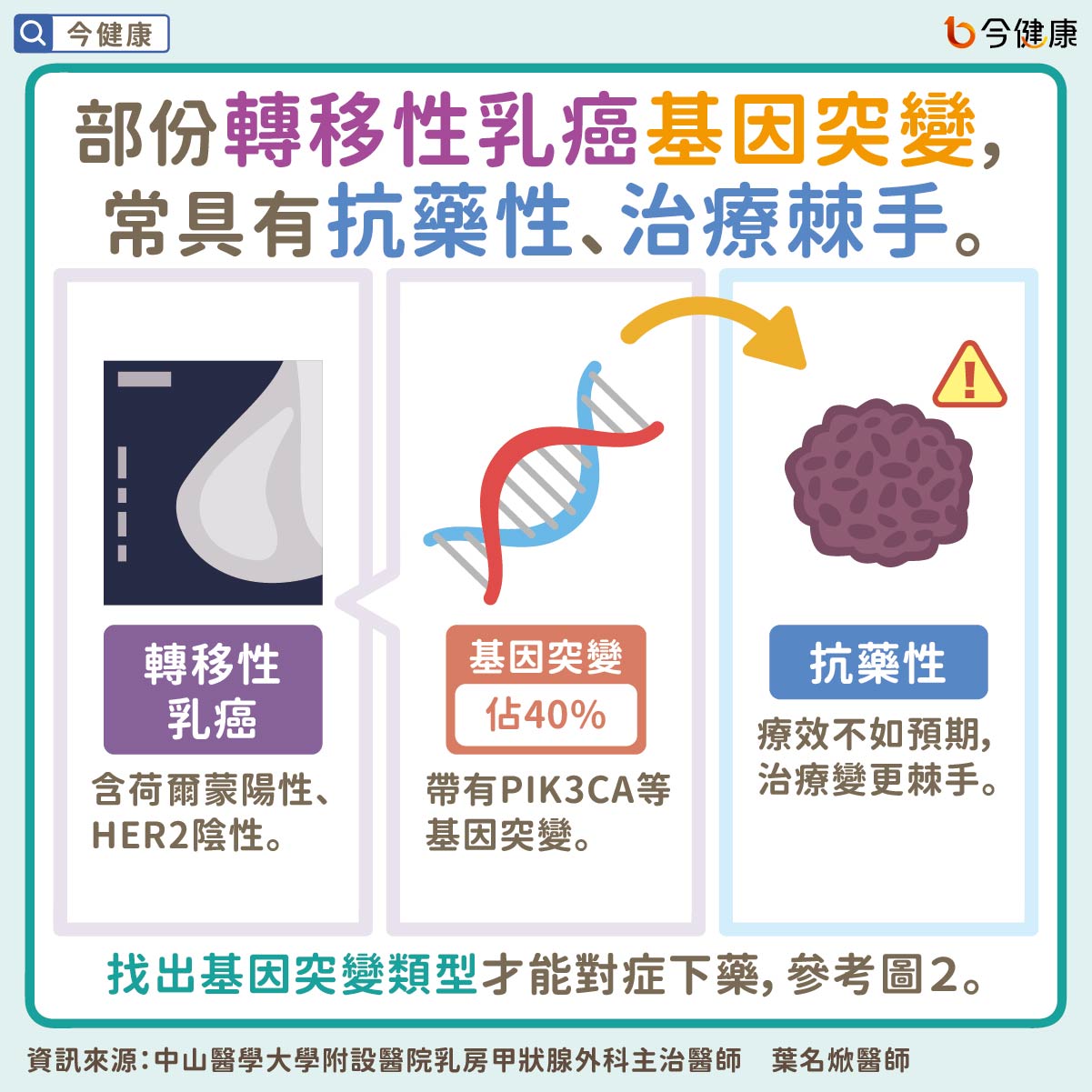 中山醫學大學附設醫院乳房甲狀腺外科主治醫師葉名焮醫師說明,荷爾蒙陽性、HER2陰性的轉移性乳癌患者中,約有40%帶有PIK3CA等基因突變,容易在治療過程中產生抗藥性,致使療效不如預期,讓治療變得更加棘手。不過這類病患已有標靶藥物可供選擇,不只能增加疾病無惡化存活期,患者的生活品質也會改善許多。