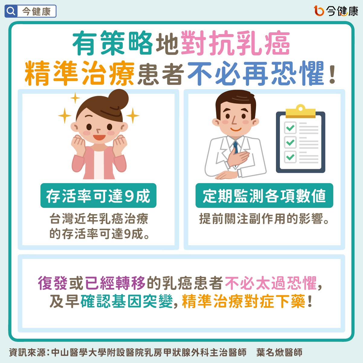 葉名焮醫師提醒,台灣近年乳癌治療的存活率可達9成,在治療過程中醫師也會定期監測各項數值,提前關注副作用的影響。復發或已經轉移的乳癌患者不必太過恐懼,及早確認基因突變類型,透過精準治療對症下藥,也能夠有效控制病情並提高治療期間的生活品質。