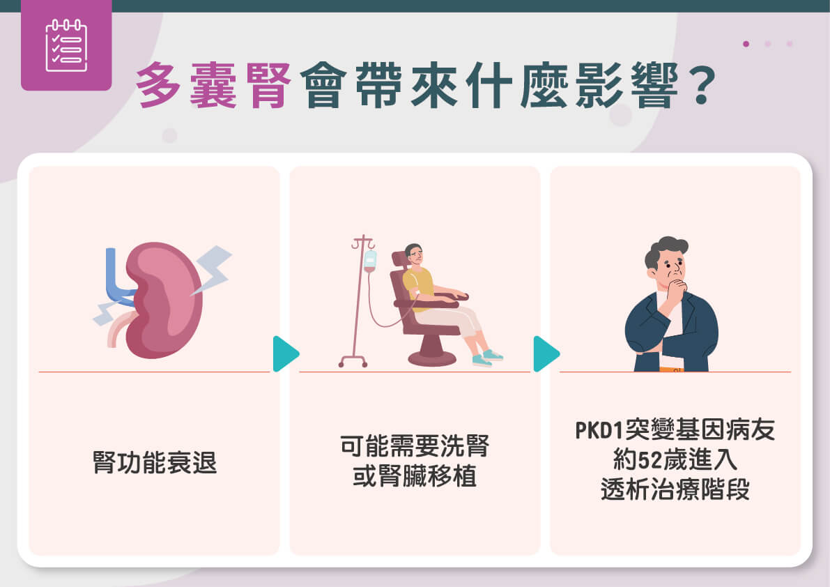 台南市立安南醫院腎臟科林軒名主任說明,多囊腎是一種遺傳疾病,因屬於顯性遺傳疾病,只要帶有疾病基因,發病率幾乎是百分之百。自己曾經遇過有一家生三個女生,結果都患有多囊腎。患者從出生開始,腎臟就會逐漸產生一顆一顆的水泡,這些大而無用的水泡會取代原先腎臟,逐步造成腎臟功能衰退,最後進入洗腎。不僅會造成腎臟功能下降,這些過度增生的水泡,也可能導致病患的腎臟膨脹成原先的十倍、二十倍以上,像是每天挺著懷孕五個月的肚子。