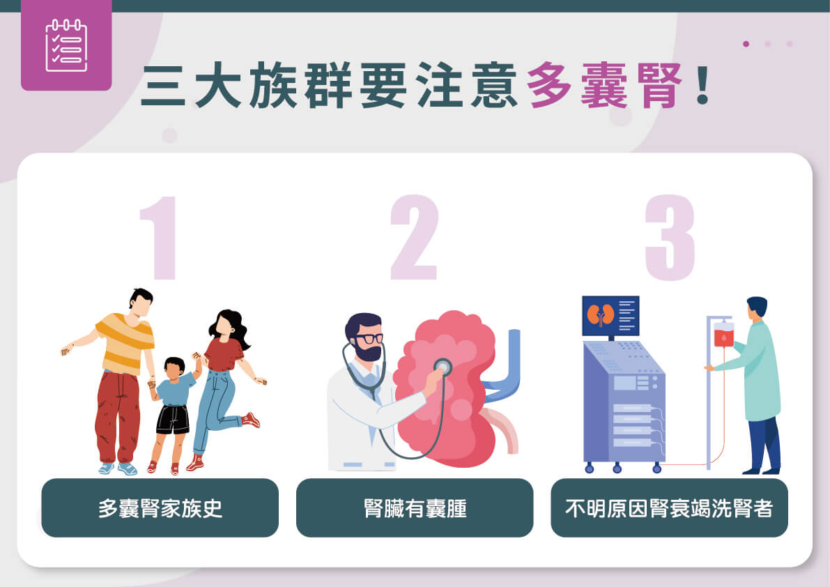 那麼該如何警覺自己可能是高風險族群?上述提及的國中生怎麼會年紀輕輕就確診為多囊腎?林軒名主任表示,確認自身是否為多囊腎高風險族群的最好方法之一,就是確認是否有家族史,若能瞭解家人有相關疾病,可以提前追蹤、開始安排治療策略。此外,仍有一定的患者不知是否有遺傳史或無遺傳史但仍發病,若檢查腎臟時發現有水泡,也建議配合醫師追蹤。透過提早介入治療,能有效延緩後續進入透析時間。