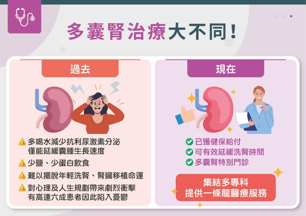 林軒名主任說,過往多囊腎無藥控制,發病初期僅能透過多喝水,減少抗利尿激素分泌,降低腎臟囊腫生長速度、緩解其他症狀,如高血壓、腎結石等;並且透過少鹽、少蛋白的飲食,降低腎臟代謝負擔。但是這樣的治療仍無法有效針對多囊腎,患者必須面臨洗腎時間提前,甚至影響後續的人生規劃。