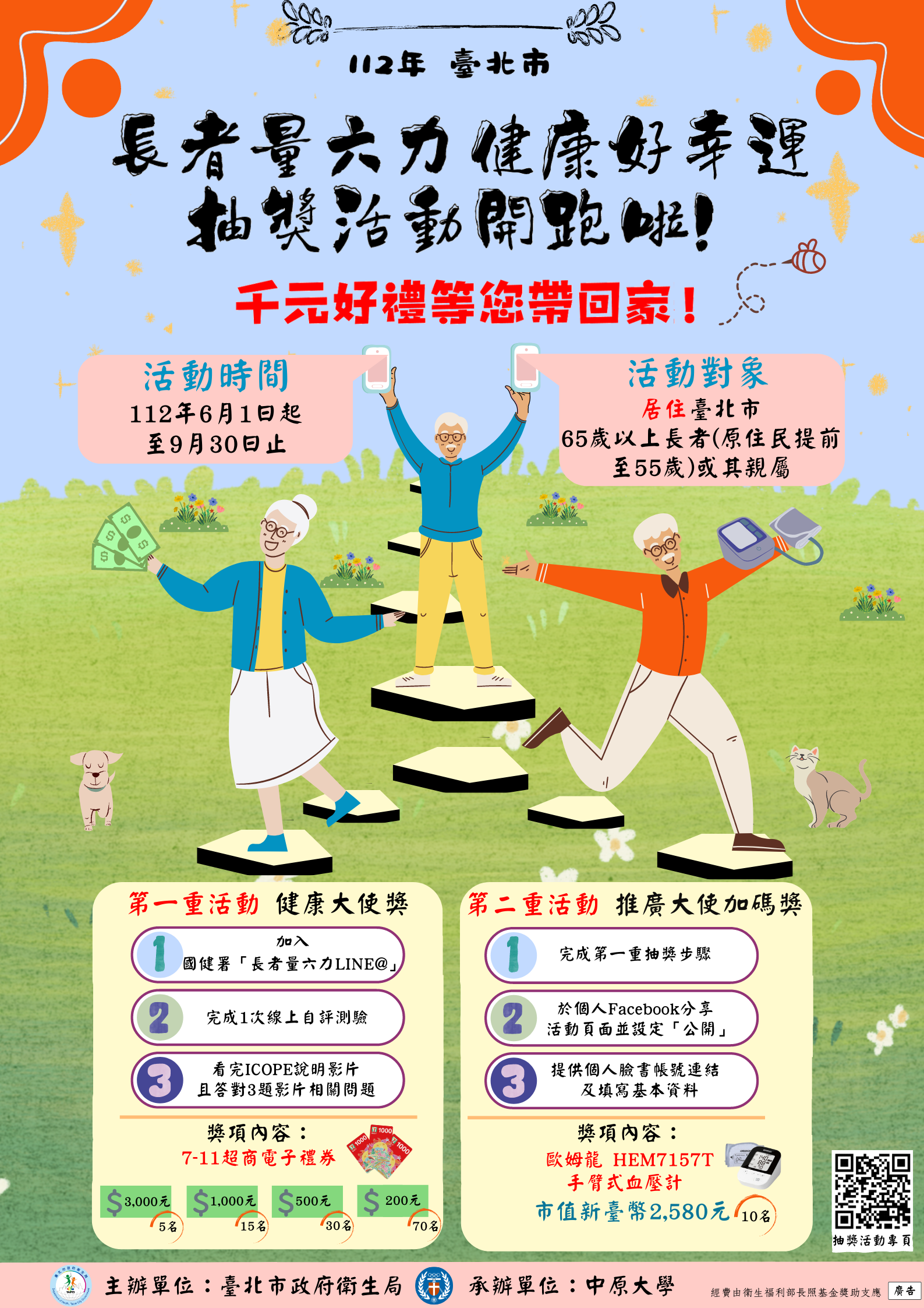 此外,凡居住台北市65歲以上民眾(原住民55歲以上)或其親屬,只要完成「國健署-長者量六力LINE@」註冊及自評,並在活動頁面完成問答測驗,就有機會抽中3,000元超商禮券,若於臉書公開分享活動頁面並設定公開,還可再抽電子血壓計。