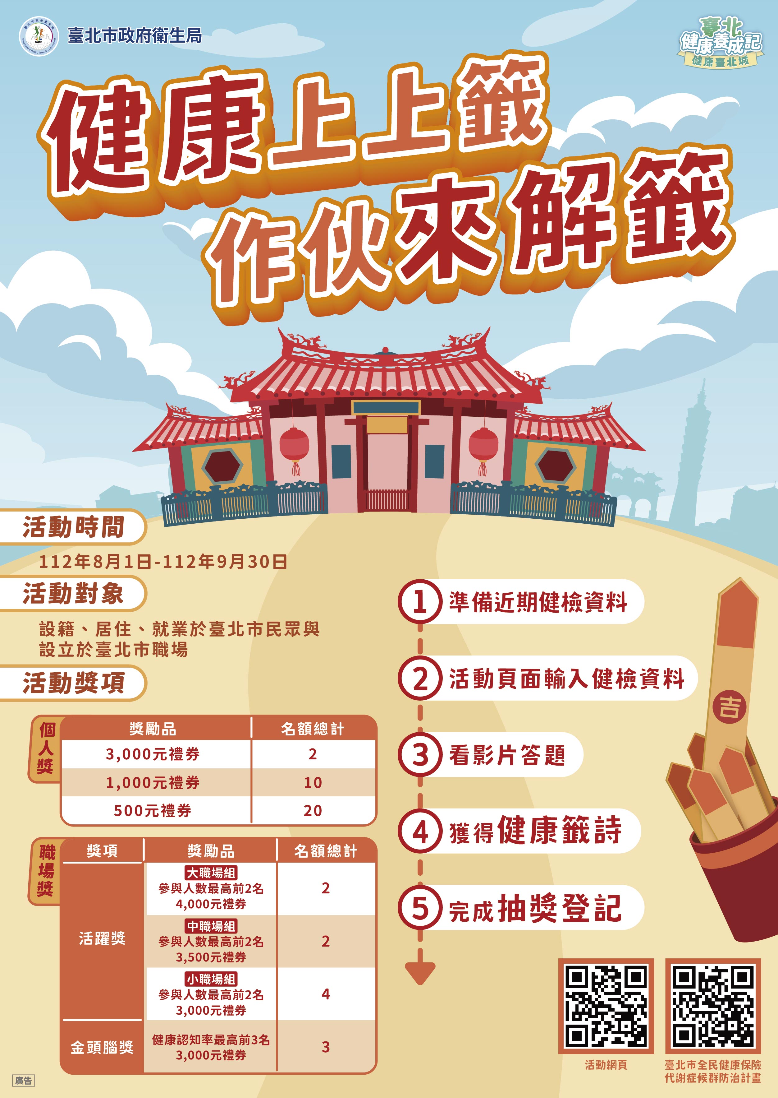 為鼓勵民眾自我健康管理,台北市衛生局舉辦「健康上上籤,作伙來解籤」提供代謝風險評估活動及「長者量六力、健康好幸運」ICOPE抽獎活動,民眾於活動頁面上傳最近一次健檢資料並完成問答測驗,即可獲得代謝症候群風險評估結果與改善建議,設立於台北市的職場也能揪團PK搶好禮。此外,凡居住台北市65歲以上民眾(原住民55歲以上)或其親屬,只要完成「國健署-長者量六力LINE@」註冊及自評,並在活動頁面完成問答測驗,就有機會抽中3,000元超商禮券,若於臉書公開分享活動頁面並設定公開,還可再抽電子血壓計。