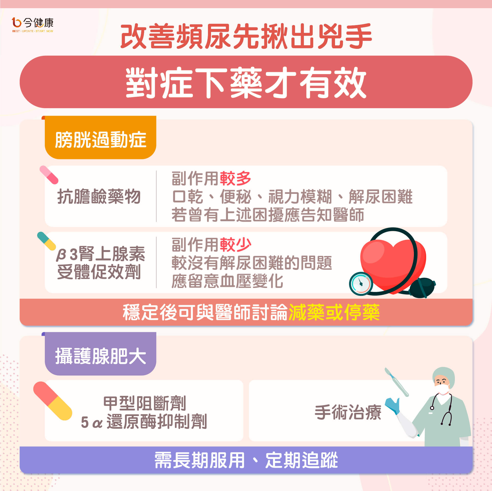 目前針對膀胱過動症的藥物治療,可以分為抗膽鹼藥物及β3腎上腺素受體促效劑,前者副作用較多,可能造成口乾、便秘、視力模糊等,若曾有以上病症的困擾、有青光眼、或曾出現解尿困難的患者應該主動跟醫師告知以調整用藥。而後者副作用較少,比較沒有解尿困難的問題,但要注意可能造成血壓升高、增加心血管負擔,患者應留意自己的血壓變化。如果是因攝護腺肥大造成的頻尿問題,則可以使用如甲型阻斷劑的藥物放鬆攝護腺來改善症狀、使用5α還原酶抑制劑來縮小攝護腺,或是選擇手術治療一勞永逸。