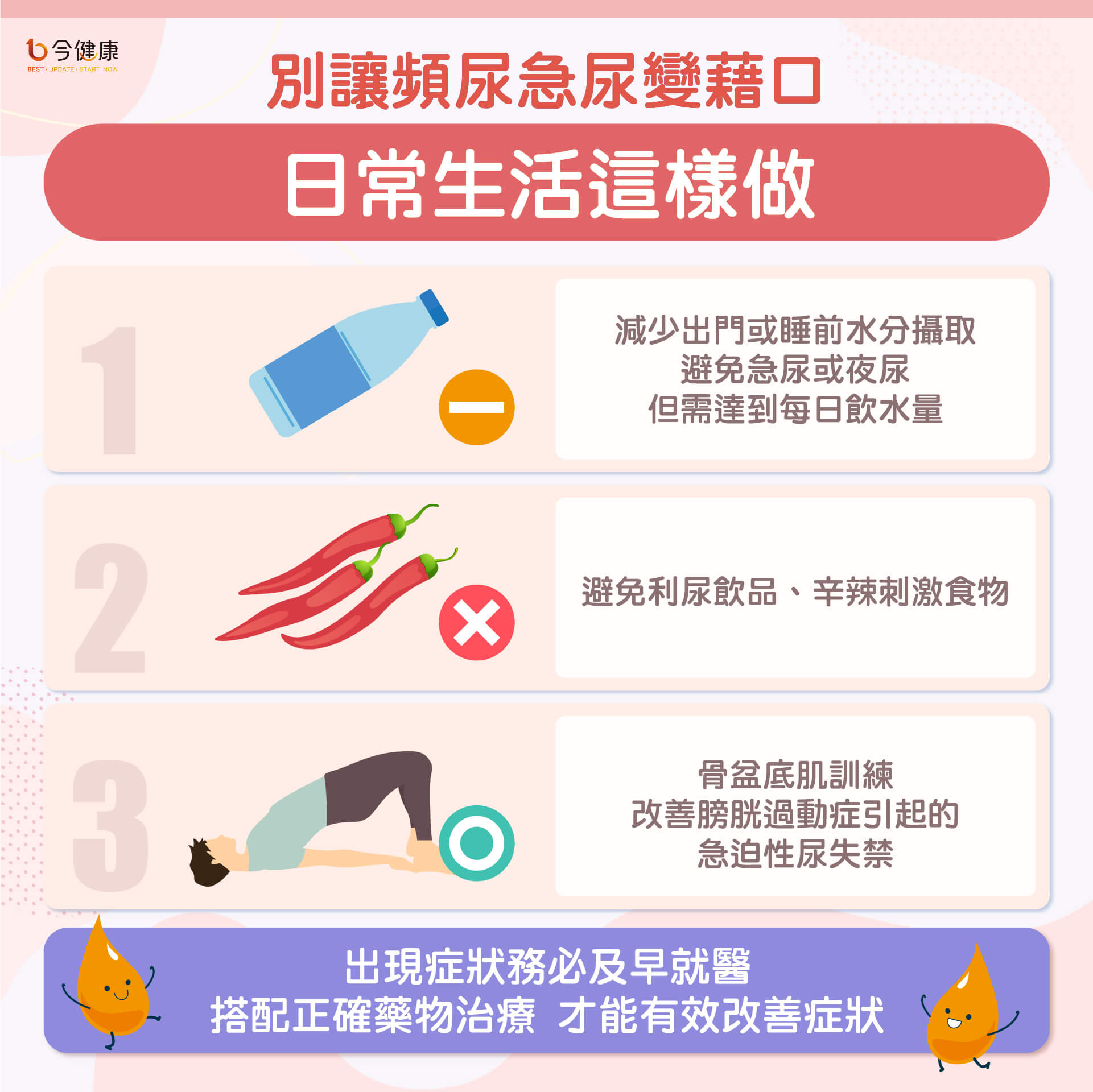 日常生活可以減少出門時和晚餐後的水分攝取,避免急尿和夜尿,但仍需達到每日飲水量;同時利尿飲品也應盡量避免,減少辛辣刺激食物;骨盆底肌訓練可以改善膀胱過動症引起的急迫性尿失禁。早期保養可以嘗試南瓜子、非洲星草等,但出現症狀時,還是要及早就醫,搭配正確的藥物治療,才能將症狀徹底改善。