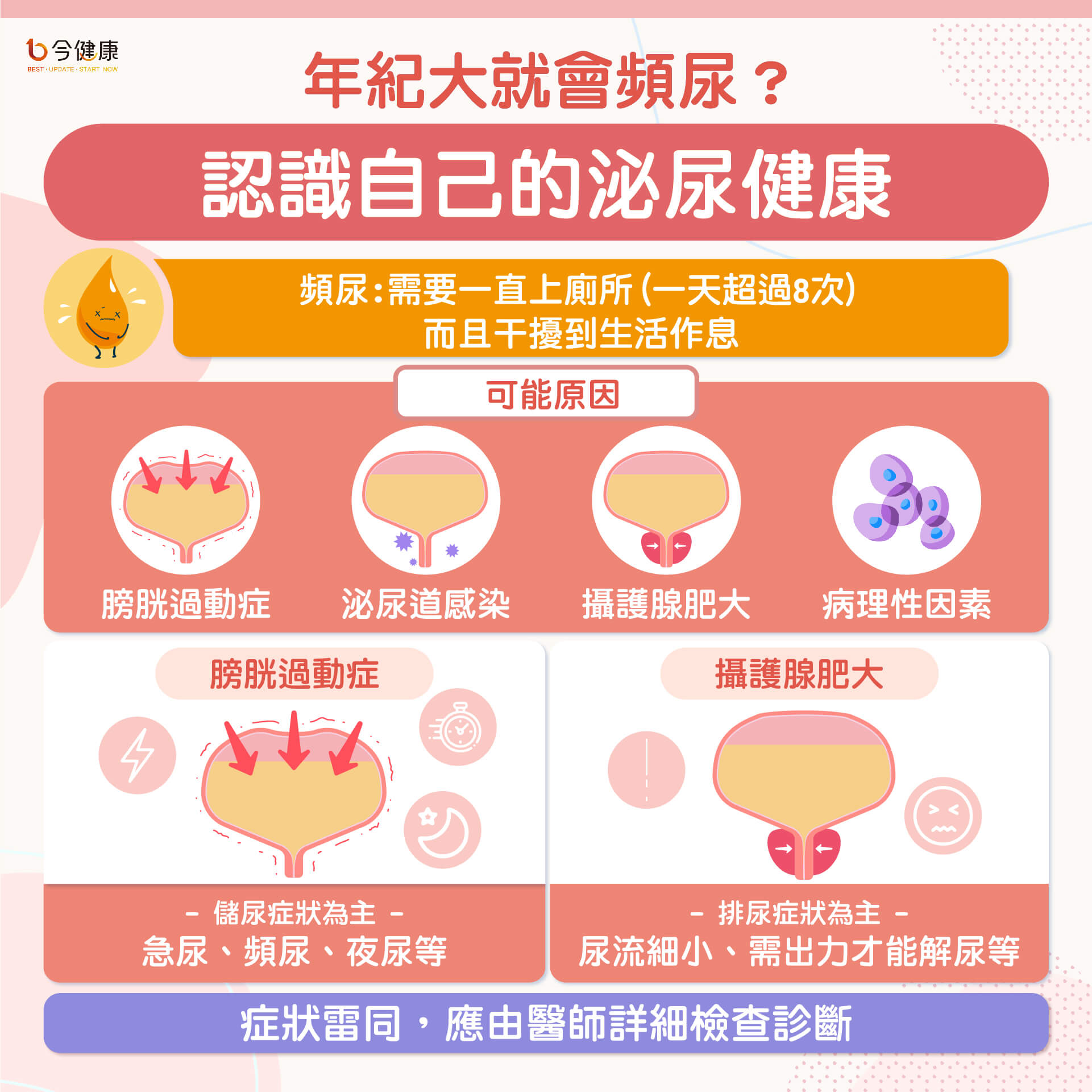 而造成頻尿的常見原因有泌尿道感染、膀胱過動症和攝護腺肥大,還有其他病理性因素也有可能。膀胱過動症是膀胱儲存尿液的功能異常所導致,以儲尿症狀為主,如:急尿、頻尿、夜尿等;而攝護腺肥大是攝護腺組織增生而壓迫尿道、膀胱等導致,以排尿症狀為主,如:尿流細小、需出力才能順利解尿等。沅京診所鄭院長提醒,由於膀胱過動症和攝護腺肥大症狀雷同,且攝護腺肥大也會引起膀胱敏感甚至過動問題,因此需藉由詳細檢查診斷,以利後續對症治療。