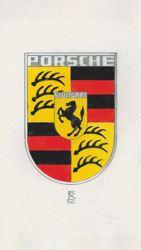 早在 1951 年間,一位名為Ottomar Domnick 博士的保時捷車迷主動發起「The Porsche Prize」競賽,打算為保時捷這個新品牌徵選廠徽。然而,比賽期間所收徵到的各種作品都不符合當時廠徽的設計需求。不久之後,1951 年底在一場於紐約舉行的商務餐敘席間,Max Hoffman 與 Ferry Porsche 的之間談話再度提及設計廠徽的想法。Ferry Porsche 在 當年12 月 27 日的筆記中寫下:「以『Porsche』字樣及斯圖加特徽章或類似標誌作為方向盤裝飾。」1952 年,才華洋溢的製圖師Franz Xaver Reimspieß 描繪出廠徽必備的重要設計元素:一匹源自斯圖加特市徽的駿馬繪於金色盾牌之中,與上方的「Stuttgart」字樣代表著車輛在祖文豪森製造的高品質保證。紅黑相間的色塊與鹿角造型則是源自於 Württemberg-Hohenzollern 州的徽飾,與「Porsche」字樣所形成的拱形,如同保護罩一般包覆著其他元素。