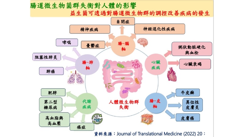 一般而言,人體腸道會存在和平共處的正常微生物,當其數量及種類減少時,則會被一些致病性病原菌取代而造成失調現象(dysbiosis),進而引發很多疾病,長年佔國人死亡率第一位的癌症就是其中一種。