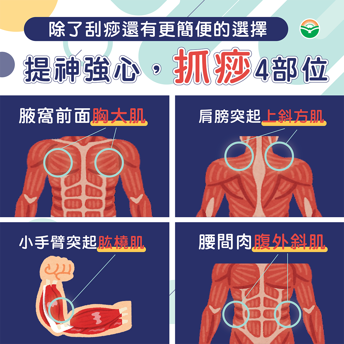 廖述賢說,抓痧可以當作診斷手法,也可以當作治療,可根據病情選擇施治部位。其他抓痧位置分別在肩頸的上斜方肌、腋窩前的胸大肌、軀幹側邊的腹內外斜肌,都是很好的抓痧位置。只要抓幾下,就可達到強心消暑去疲勞效果。