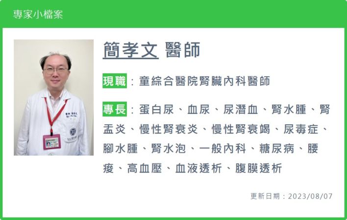目前健保署已針對第五期慢性腎臟病,也就是腎絲球濾過率小於15% 的患者給予健保給付,透過此療法幫助患者維持基本日常生活;簡孝文醫師分享,臨床上不少六、七十歲年長患者,在接受酮酸胺基酸治療約半年後回診檢查,不僅明顯發現小腿肌肉較扎實,抽血報告也發現腎臟惡化速度變慢,身體營養指標白蛋白也相較穩定,提高患者存活率。預防腎臟病提高警覺 發現腎功能下降應盡快檢查