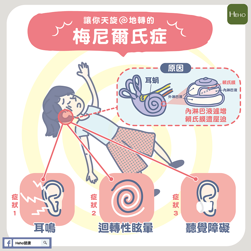 中國醫藥大學衛教資訊便指出,梅尼爾氏症是一種內耳疾病,某種原因引起內耳淋巴產生過多或吸收不平衡造成內淋巴水腫。典型的美尼爾氏症會出現眩暈、耳鳴、聽力障礙、伴隨噁心想吐等,發作時間由數分鐘到數小時不等。