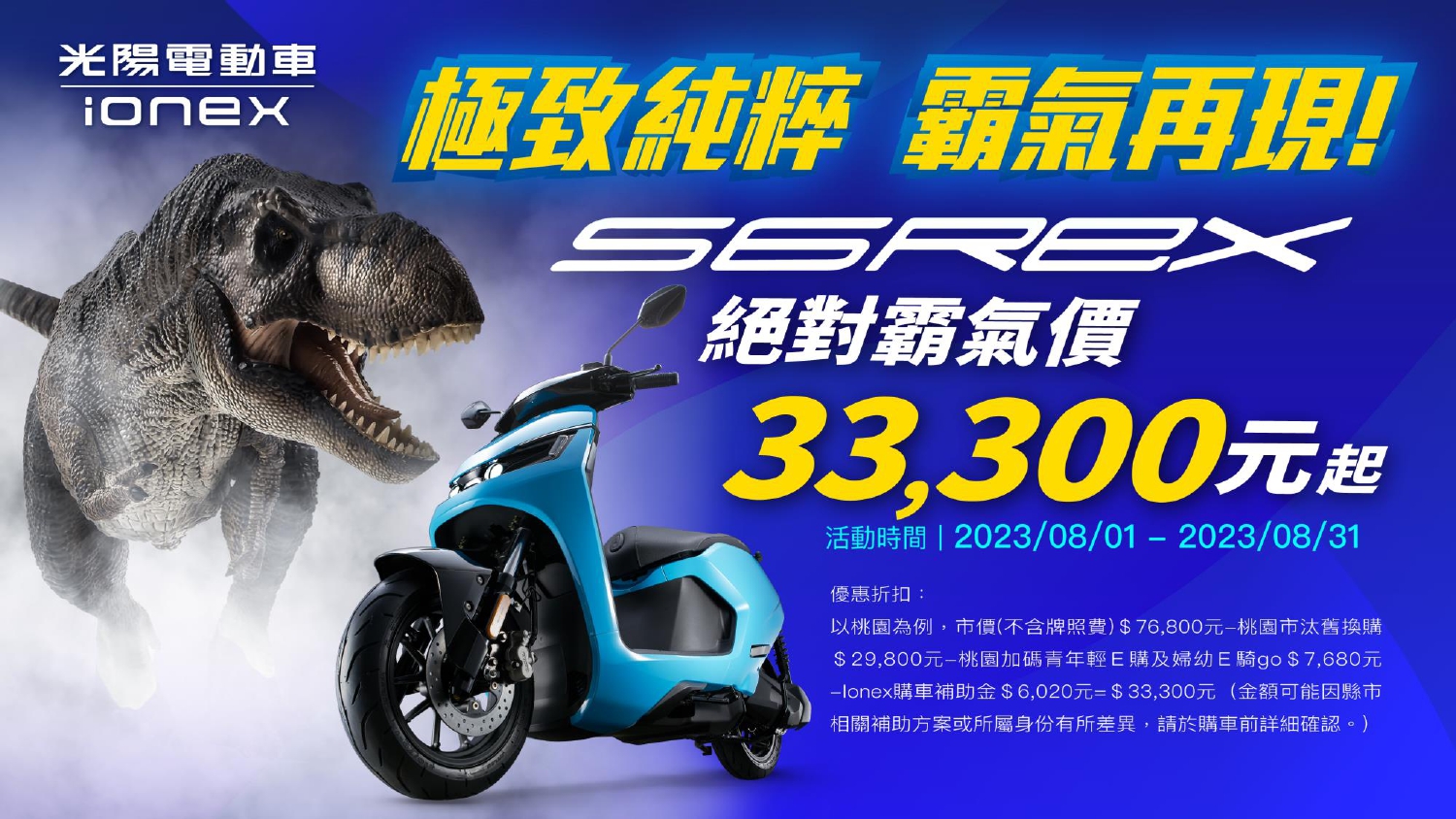 此外,為搶攻暑期商機,Ionex 光陽電動車也加碼暴龍系列「純粹機能」S6Rex 購車補助金 6,020 元,搭配汰舊換新最低只要 33,300 元就能騎回家!(以桃園市為例,S6Rex 建議售價 76,800 元-Ionex 購車補助金 6,020 元-桃園市汰舊換新 29,800 元-桃園加碼青年輕 E 購及婦幼 E 騎 go 7,680 元 = 33,300 元)。