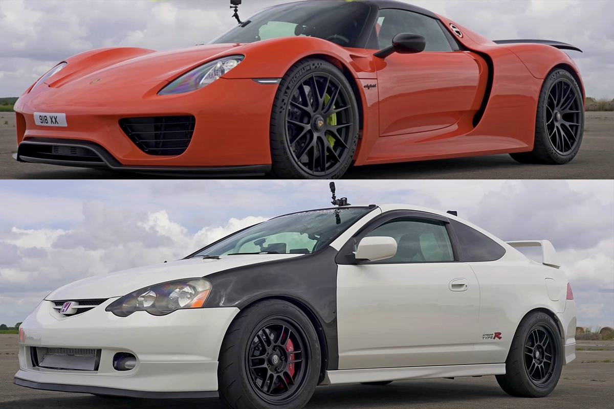 918 Spyder於當時是Porsche旗艦跑車,其搭載的4.6升V8自然進氣引擎搭配兩具電動馬達,進而有著887hp最大馬力,但這次它的對手遇上經過大改有近千匹馬力的Honda Integra Type R,至於誰贏誰輸不到終點線前真的很難說。