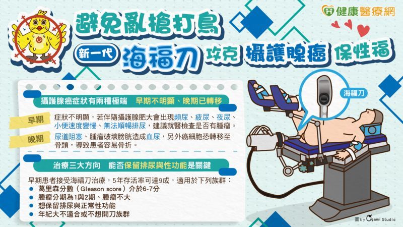 【健康醫療網/記者鄭宜芬報導】攝護腺癌高居全世界男性第2常見的癌症,不少名人深陷攝護腺癌之苦。台灣泌尿科醫學會理事長暨林口長庚醫院教授馮思中表示,台灣2025年將進入超高齡化社會,攝護腺癌罹患率逐年攀升。臨床上治療攝護腺癌包括手術與放射等方式,但傳統手術「不管三七二十一通通切掉」,患者人生變黑白!一位43歲病友經由新一代海福刀(HIFU)治療,術後配合回診,恢復狀況良好,更保有排尿與性功能。