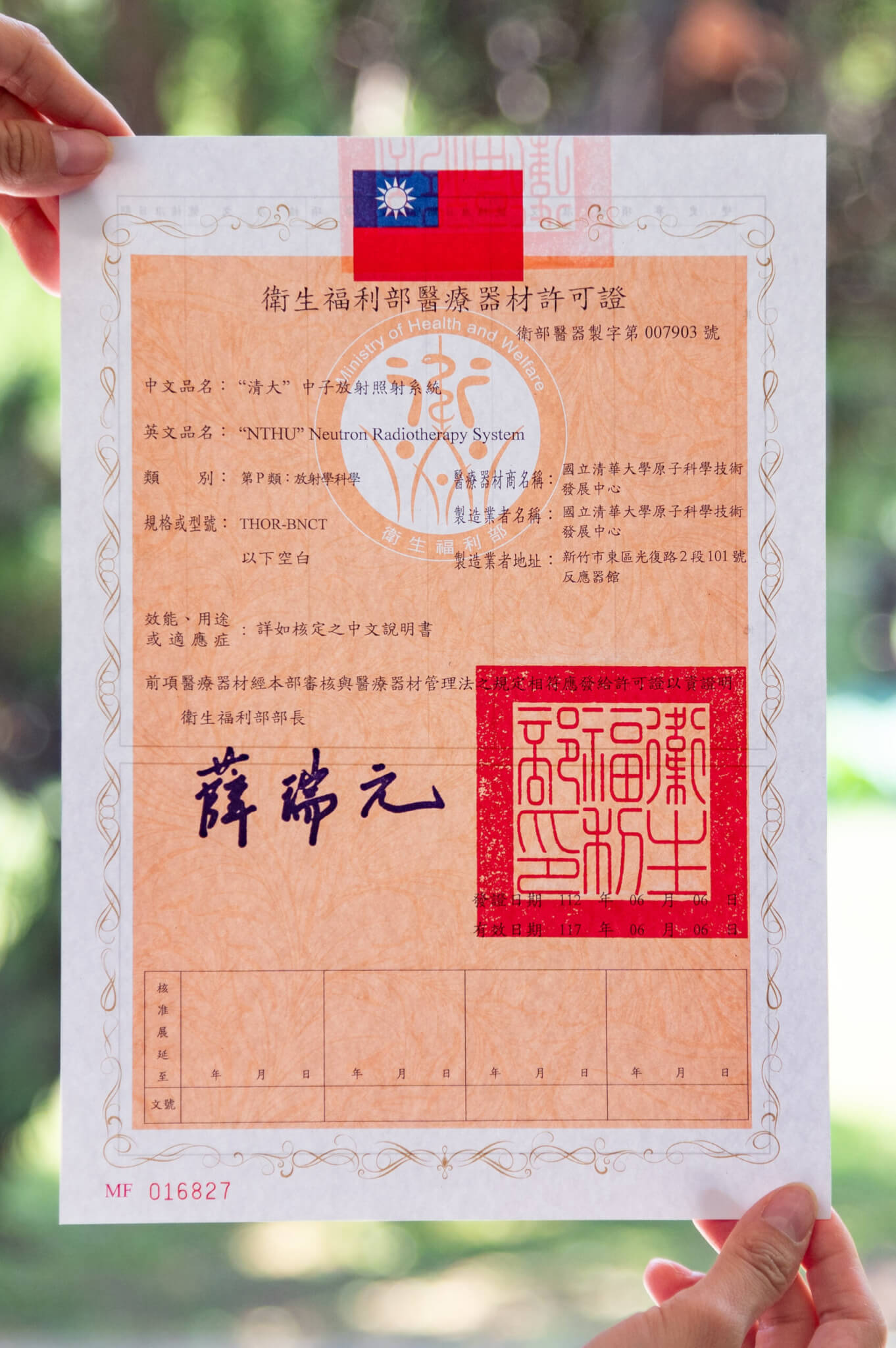 目前清華大學硼中子捕獲治療建立的「清大中子放射照射系統」,歷時 3 年送件和審議,終於在今年 6 月取得衛福部頒發的醫療器材許可證,不僅是全國唯一、也是全球首例。