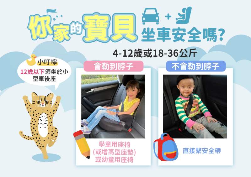 交通部也表示,12歲以下的孩童須坐於後座,4-12歲或18-36公斤孩童若安全帶不會勒到脖子可以直接繫安全帶,但若會勒到脖子則須用增高型坐墊、學童用或幼童用安全座椅。
