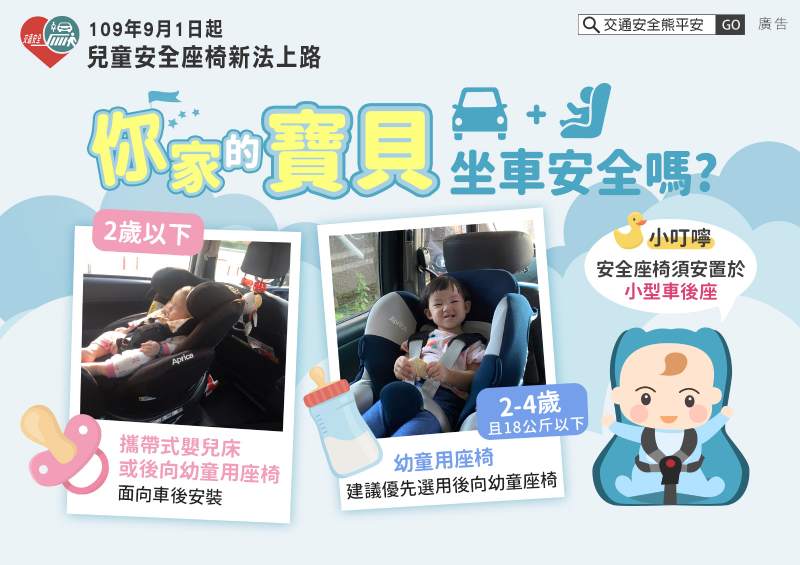 交通部《小型車附載幼童安全乘坐實施及宣導辦法》也規定,2歲以下幼童應安置於車輛後座,並用後向式安全座椅,同時也建議2-4歲且18公斤以下幼童優先選用後向式安全座椅。