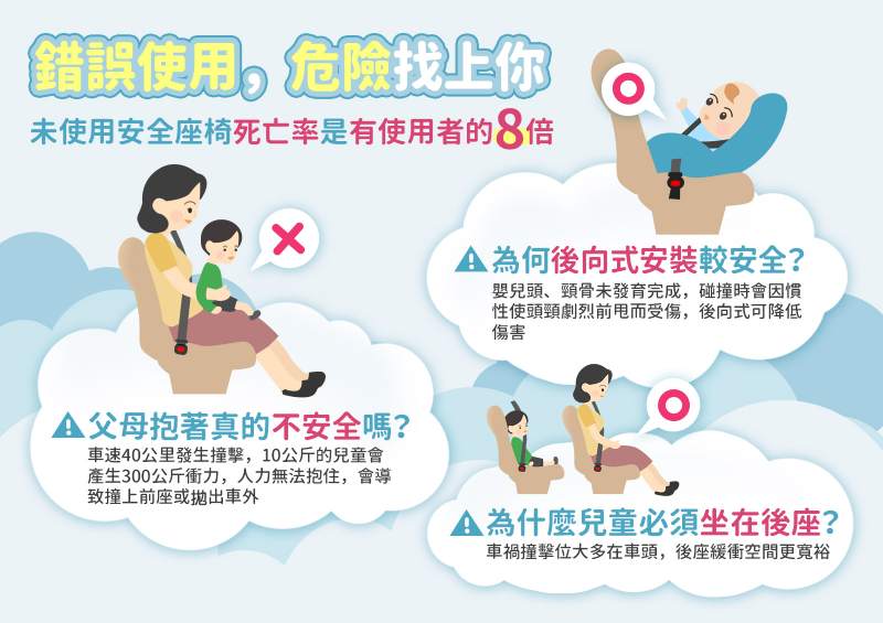 台灣兒科醫學會理事彭純芝表示,有研究指出,意外的衝擊力約為孩童體重的30倍甚至更高,家長抱著寶寶時如果發生車輛撞擊,手臂是無法阻擋承受其衝擊力的,寶寶很可能會因為撞擊慣性,而被拋出車外。