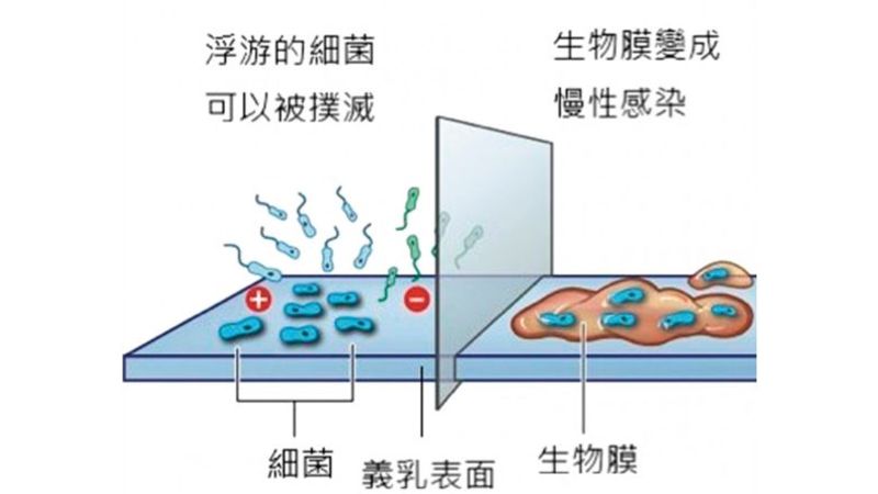 環境中的細菌以浮游及生物膜的形式存在。浮游的細菌容易被血中的抗生素撲殺。生物膜指的是細菌的菌叢以及其分泌的黏液一般會聚集在生物或非生物的表面,側如牙垢。生物膜內的細菌困難以抗生素控制,變成慢性感染。義乳表面的生物膜可能是莢膜攣縮的最大禍首。