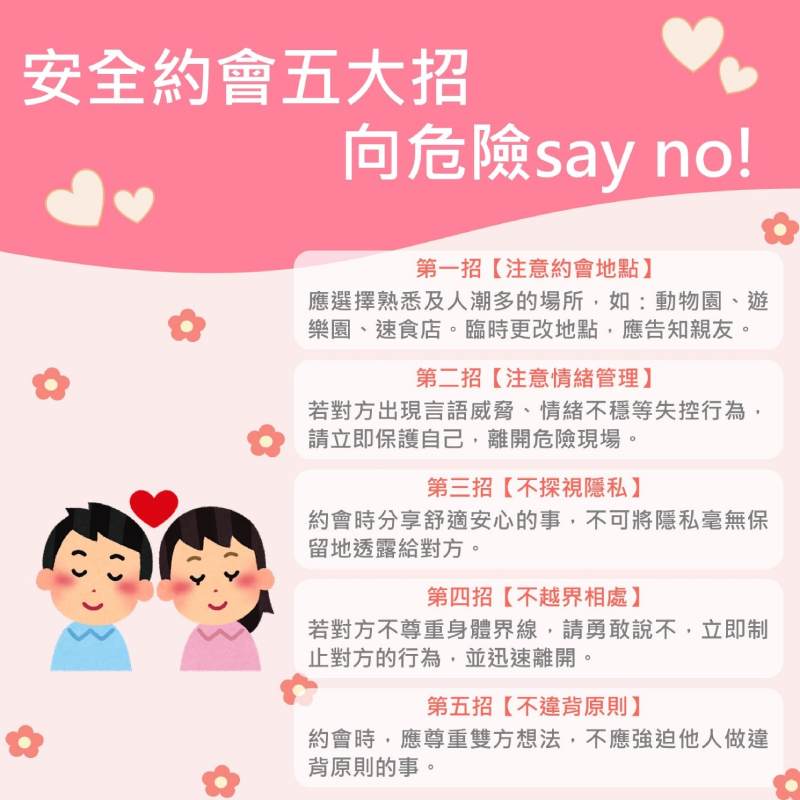 第四招,「不越界相處」。約會過程中,身體接觸應是自然和諧的交流,若對方不尊重,以花言巧語的方式,超過身體的那道界線,應勇敢說不,立即制止對方的行為,並迅速離開。